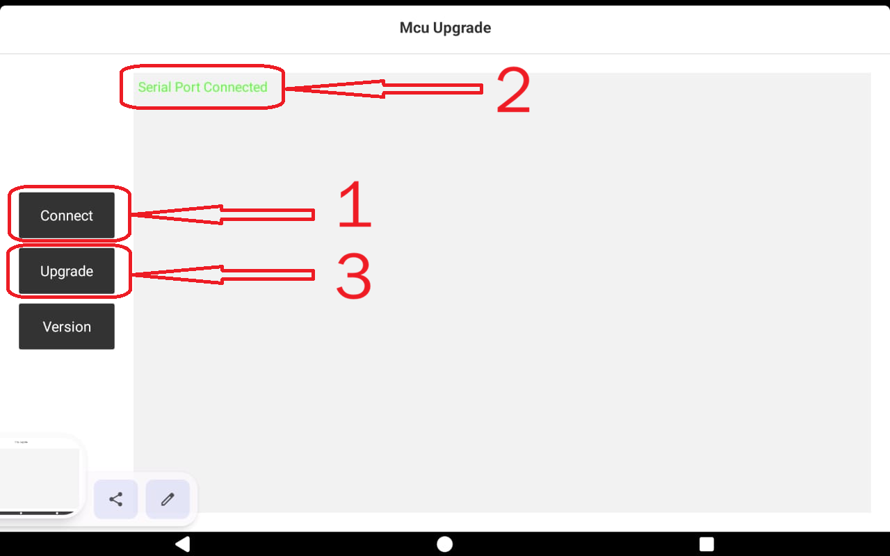 - Після натискання кнопки « Connect» з’явиться повідомлення «Serial Part Connected». Потім натисніть «Upgrade» і дочекайтесь завершення оновлення. Під час процесу оновлення світитиметься лише крайній правий зелений індикатор у нижній частині ПДК.
