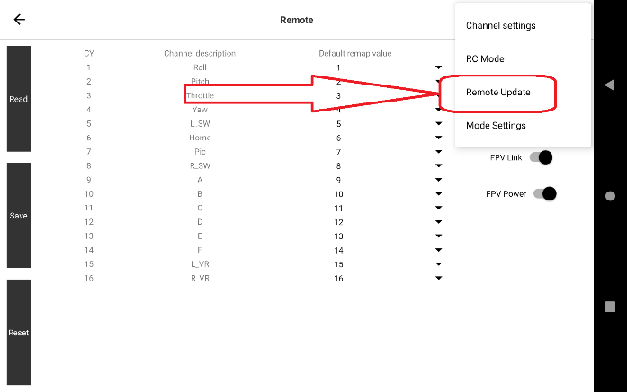 - Для цього заходимо в «Settings Assistant», далі «RC SETTING», натискаємо на «три крапки» в верхньому правому куті, вибираємо «Remote Update»